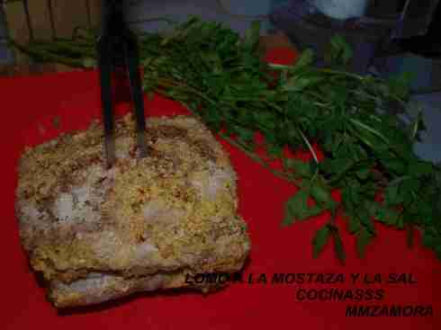 3º-Cogemos el bote de la mostaza y con una cucharita pequeña ponemos salsa por toda la parte superior del lomo. Como si pusieras mantequilla en el pan.