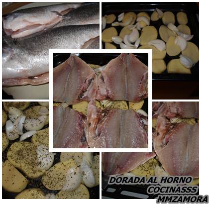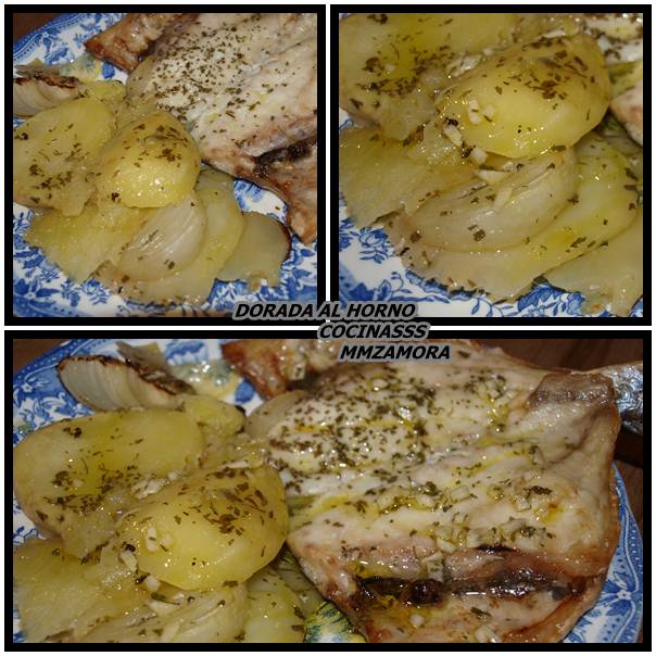 4- Ponemos en el horno unos 20 o 25 minutos, a 175º. Después servimos las patatas, las cebollas y la dorada. Picamos unos ajitos,perejil y aceite, removemos bien y servimos, como si fuese una vinagreta, por encima de las doradas.