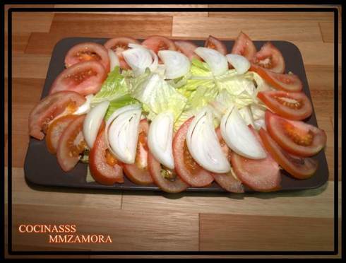 1- Partimos que toda le verdura está lavada y limpia siempre. Cortamos la lechuga ( a mi todo me gusta en trozos pequeños) y vamos poniendo alrededor el tomate y la cebolla. Con esta ensalada recibí la ayuda de Àlex de la Cruz, que cortó todos los ingredientes y los colocó en la fuente.