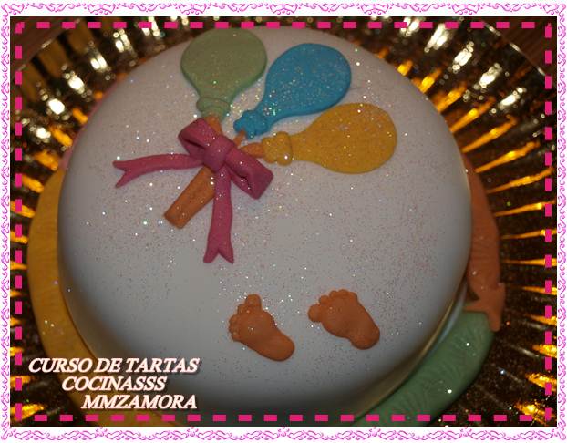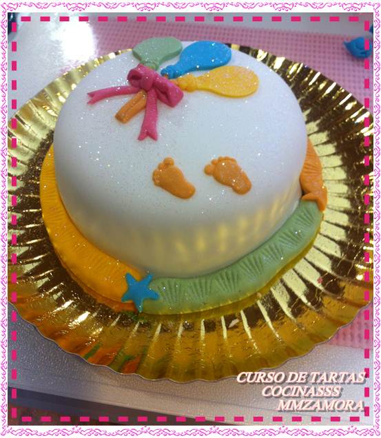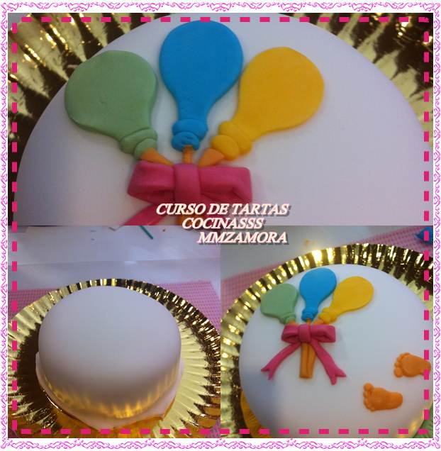 En mi caso la tarta era para mi hijo así que le puse unos globos, como el fondant era blanco, los tinté, como véis en las fotos, de naranja, verde y azul y después corté con un utensilio con forma de globo y agregue unos piececitos para darle un toque original, también hechos con un molde de silicona que nos proporcionó la “profe”.