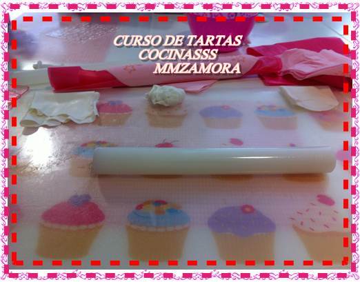 Bueno ahora se trabaja el fondant, que se compra ya preparado, para que os hagáis una idea aquellos que no sepáis qué es el fondat su textura es algo parecido a la plastilina, se amasa con un rodillo de silicona y se va extendiendo con forma de pizza.