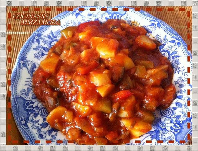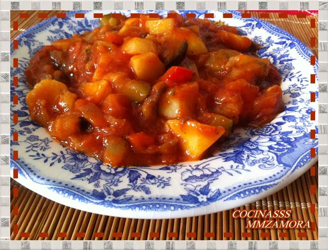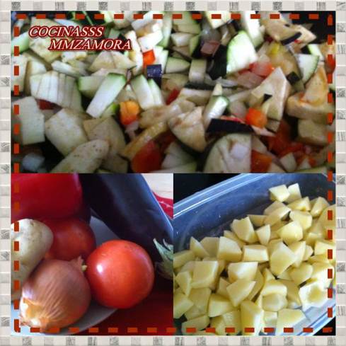 El pisto siempre lo ha hecho mi madre riquísimo, y ella, cuando lo servía, le añadía patatas fritas en cuadraditos; yo lo he hecho como siempre con su receta, pero en vez de añadir las patatas fritas las he hecho en el microondas, así que sin nada de grasa, y también muy ricas, pero para que nos vamos a engañar, como las patatas fritas y crujientes no hay nada ajjajajjaj!!!!!!!!!!!
