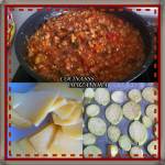 3º – Después de haber horneado la berenjena la vamos poniendo en una bandeja por capas, primero una de tomate frito, si tienes tomate frito casero mejor, si no, pues un buen tomate, después una capa de berenjenas otra de carne y un poquito de queso, así repetimos la operación dos veces más. Por lo tanto habría puesto unas tres capas de berenjenas, carne y queso.