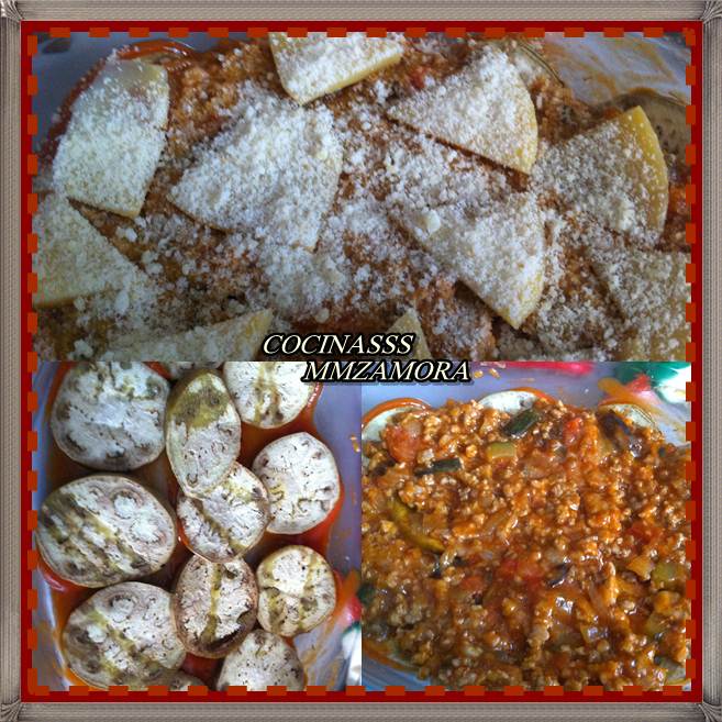 Tenía en el congelador carne que utilicé para hacer espaguetis, y la he aprovechado para hacer una lasaña. La carne lleva un buen sofrito de verduras, especies y tomate. Pero esta vez no utilicé las láminas de pasta, sino que las sustituí por berenjenas. A mí me gusta mucho la berenjena, sobre todo como la comemos en Málaga, frita con poco aceite, y con miel; esta receta la haré otro día, hoy la he horneado y servido como una lasaña, con diferentes quesos y ha quedado un plato exquisito.