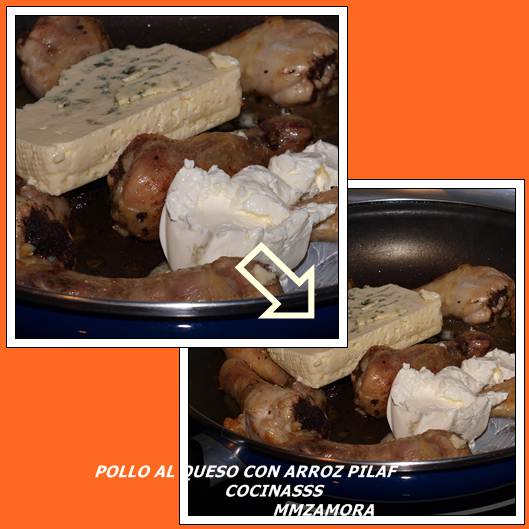4º Servimos el pollo con la salsa de queso y el arroz.