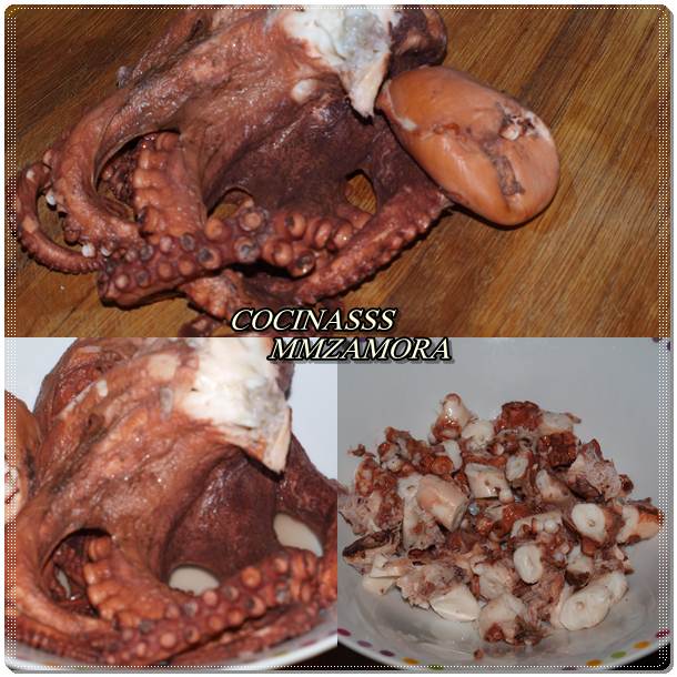 2º En la olla exprés con mucha agua y sal, añadimos una hoja de laurel, cuando empiece a hervir ponemos el pulpo entero. El pulpo no tiene prácticamente ninguna preparación, sólo hay que limpiar la cabeza del pulpo, pedirle al pescadero que os lo limpie. Si no es así tenéis que vaciar por completo la cabeza, quitar los ojos y la boca. Si cocéis el pulpo en una olla normal pues unos 45 minutos por kilo, si es la olla exprés 20 minutos, el pulpo no tiene que quedar excesivamente blando.