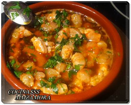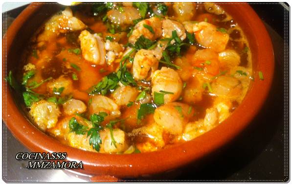 2º – Para hacer el pil-pil me gusta utilizar una vasija de barro, pongo medio dedo de aceite y cuando empieza a calentarse agrego los dientes de ajos muy picaditos.