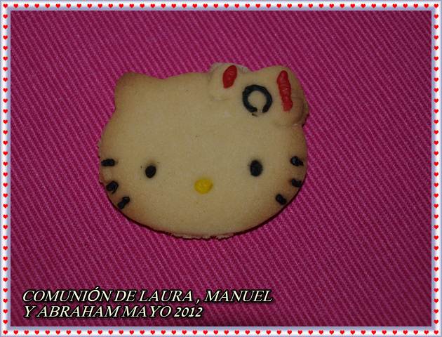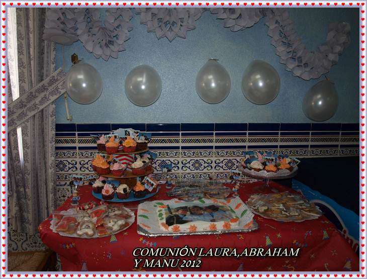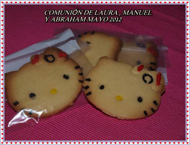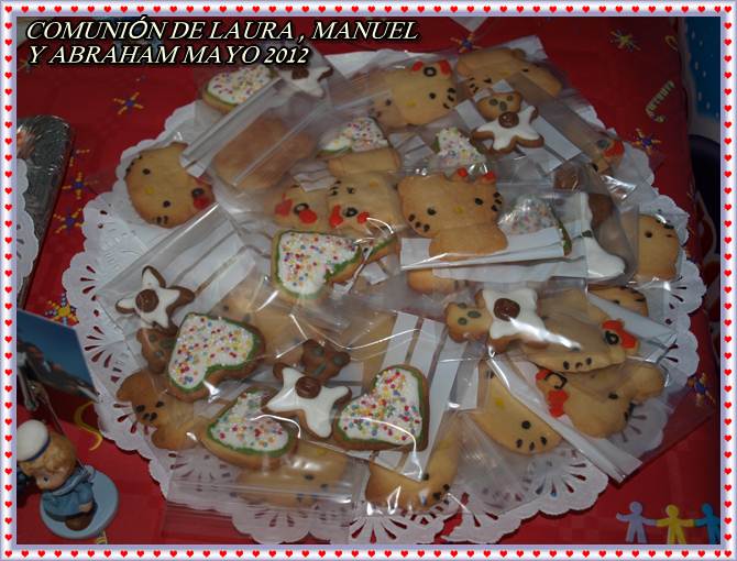 Bueno, llegó el día!!!!, dos sobrinos y un primo, hacían la comunión. Y los tres a la vez, como somos todos familia, pues se unificó la celebración, así que me puse manos a la obra para montar un “momento dulce” dedicado a los tres. Se me ocurrió primero hacer unas galletas de mantequilla, utilicé varios moldes como Hello Kitty, ositos, corazones y galletas rectangulares donde pegué la foto de los tres con obleas comestibles. También hubo cup cakes de varios sabores y decorados.