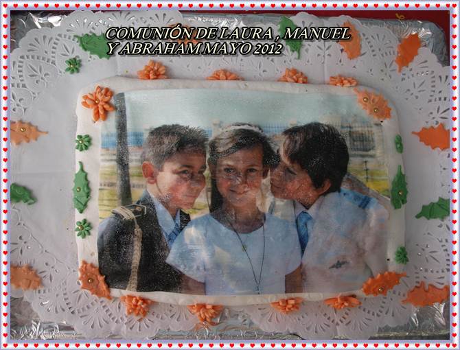 y la tarta con una oblea de papel comestible con la foto en grande de Laura, Manuel y Abraham.