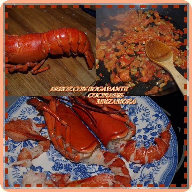 1º – Partimos los bogavantes por la mitad, quitamos la cáscara de la cola dejando la de la cabeza. Con las cáscaras y las cabezas,un poquito de agua, y laurel podemos hacer un jugoso caldo.
