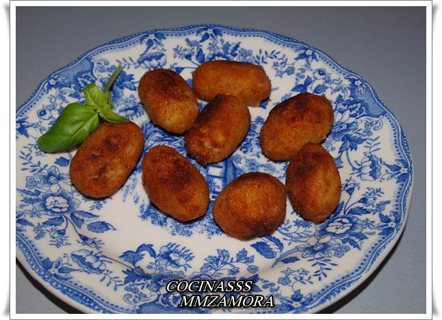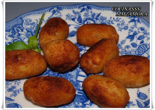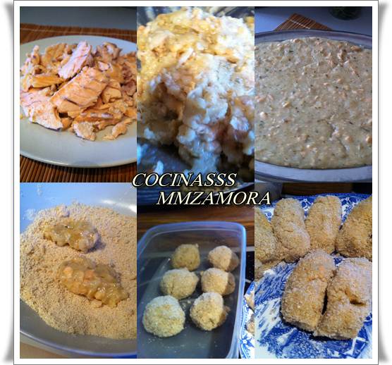 5º- Vierto en una fuente y dejo enfriar. Después de un par de horas se da la forma a las croquetas, se pasa por harina, huevo y pan rallado y se fríen en abundante aceite a temperatura media.