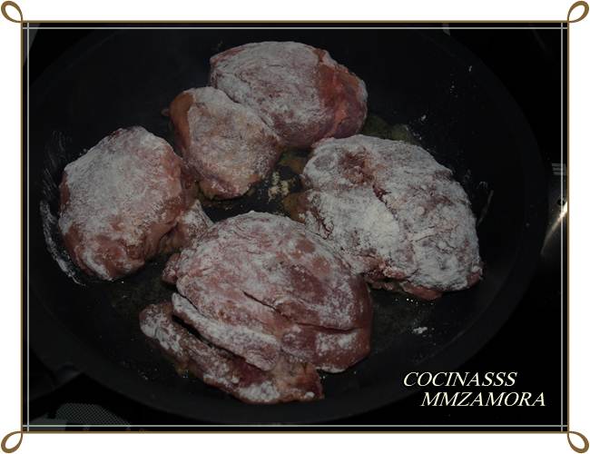 1- Enharinamos las carrilleras, ponemos dos cucharadas de aceite de oliva en una sartén y freímos la carne salpimentada. Doramos un poquito por ambas caras, sacamos y reservamos.