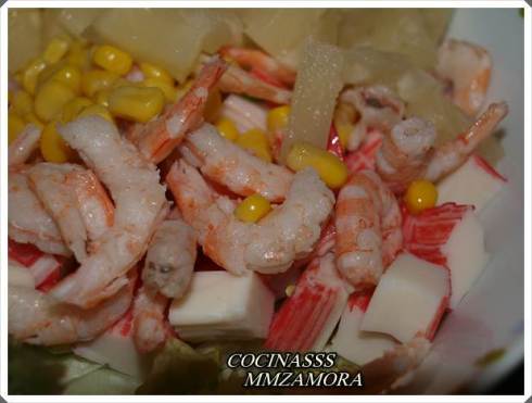 2- Cortamos la lechuga (ya limpia), y ponemos en un bol, junto a los palitos de surimis en trocitos, el maíz, las gambas, la piña, y por último el aguacate, todo bien cortadito.