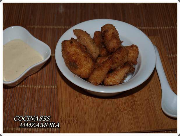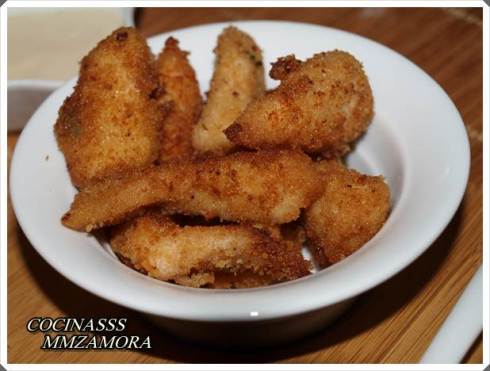 Es un plato que puede utilizarse como aperitivo, cuando vienen algunos amigos, o si querremos hacer una cena rápida, y además se puede utilizar tanto pollo como pescado. El pescado blanco también queda muy rico de esta manera y además el rebozado puede ser de varios tipos, como por ejemplo  con frutos secos, sésamo o en este caso pan rallado, que es lo que he utilizado.