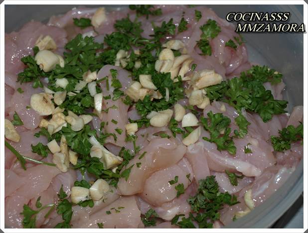 1- Primero el pollo se corta en tiras , y salamos. Después se parte el ajo en trocitos , el perejil, y el limón, y se lo incorporamos todo al pollo. Dejamos macerar un par de horas en la nevera.