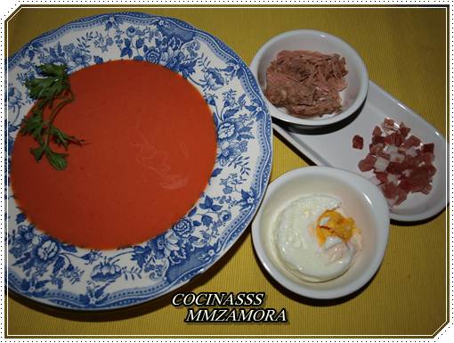 La crema hay que tomarla fresquita así que se recomienda ponerla en la nevera un par de horas antes de comer, se sirve en cuencos y ahora se pone aparte, el jamón en trocitos muy pequeños y huevo duro también en trocitos pequeños, aunque en mi casa también se pone atún .