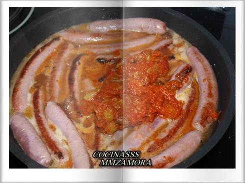 2- En una sartén, con fuego medio, agregamos aceite de oliva y vamos dorando las salchichas. Una vez doradas incorporamos el vino y el tomate, dejamos cocer un par de minutos. En mi caso tenía un poquito de pisto que había hecho el día anterior, la receta del pisto la publique el día 17 de abril de 2012 http://wp.me/p25apU-hF donde explico los ingredientes y la forma de hacerlo. Dejamos a fuego lento unos 7 ó, 10 minutos.