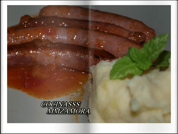 En esta ocasión he acompañado las salchichas con un estupendo puré de patatas casero, aunque la guarnición puede ser desde las patatas fritas, el arroz, hasta unos calabacines a la plancha, eso depende de lo que tengamos más a mano en casa o pensando en el gusto del comensal.
