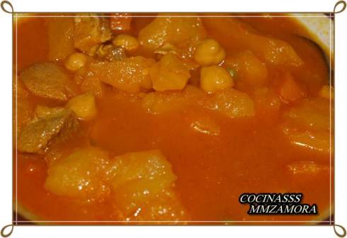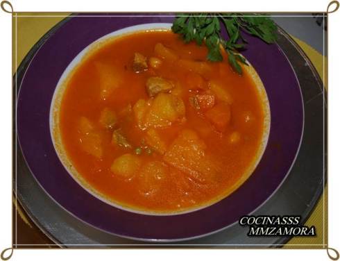 4- A la olla con el caldo, la carne y los garbanzos, agrego las verduras batidas, y las patatas peladas en trozos más o menos iguales, pruebo de sal y rectifico. Añado el colorante o el azafrán, como el azafrán es muy caro pues se suele utilizar el colorante alimentario.