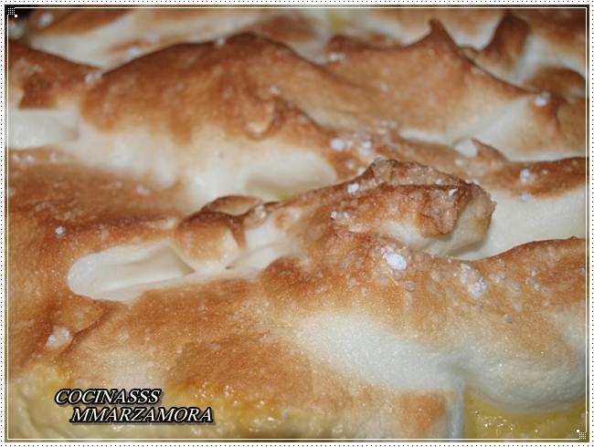 5- Añadimos de forma irregular el merengue sobre la crema de limón, espolvoreamos un poco de azúcar glas, y horneamos sólo al grill. Con éste ya caliente, un par de minutos a 180º. Hay que vigilar para que no se queme el merengue.