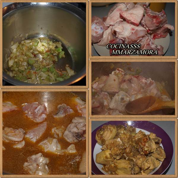 2- Añadimos el pollo y rehogamos unos minutos, después añadimos el caldo, la cucharada de salsa de carne, el curry, y dejamos cocer 30 minutos a fuego lento.