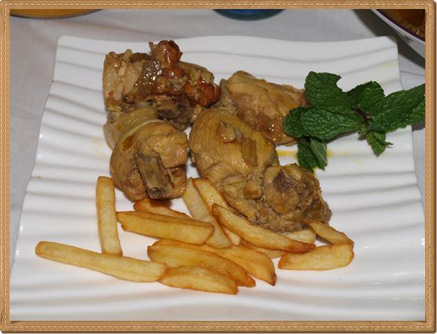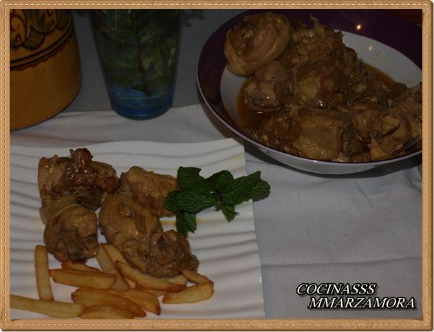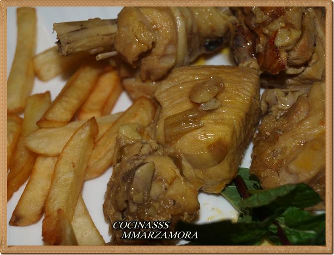Qué mejor acompañamiento que unas patatas fritas, están riquísimassssss!!!!!!!!!! y para acompañar el pollo quedan estupendas, aunque también podemos poner arroz refrito con ajos, verduras rehogadas con especias, o puré de batatas,, en fin muchas alternativas, pero para qué negarlo,,, que el mejor acompañamiento del mundoooooooo son las patatas fritassss con aceite de oliva!!!!!!!!