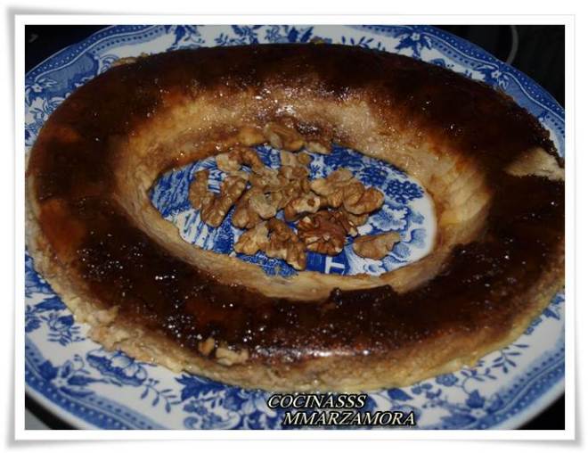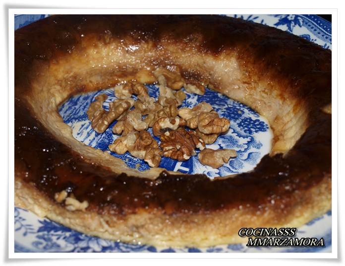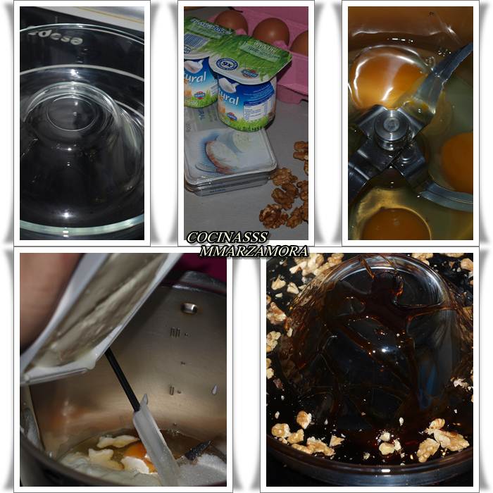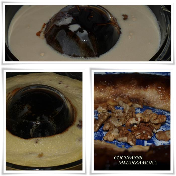 1- Yo compro el caramelo líquido, porque aunque el caramelo es muy fácil de hacer, me parece más limpio y rápido el caramelo ya hecho. Vierto una generosa cantidad de caramelo líquido sobre el molde. En esta ocasión en un molde de cristal de pyrex con abertura en medio, para que quede con forma de volcán .