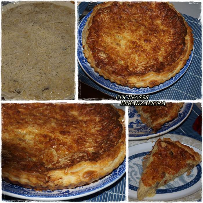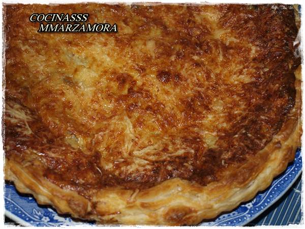3-En una bandeja colocamos el hojaldre que perforamos con un tenedor. Volcamos todos los ingredientes encima del hojaldre, añadimos queso rallado y metemos en el horno pre calentado.