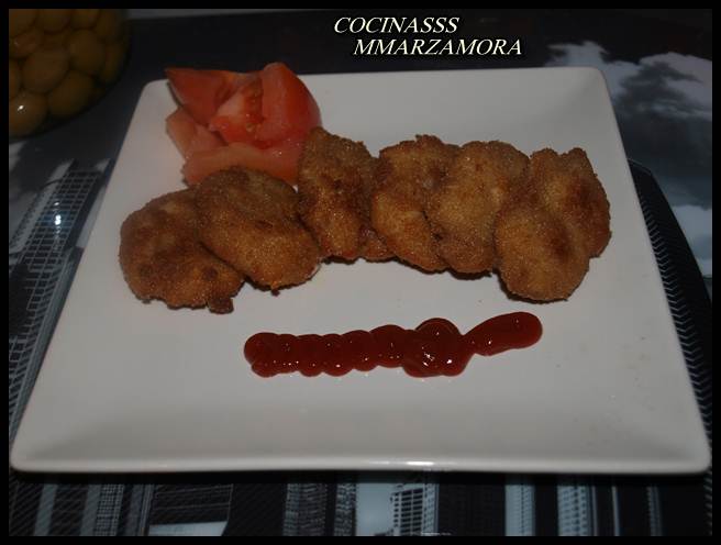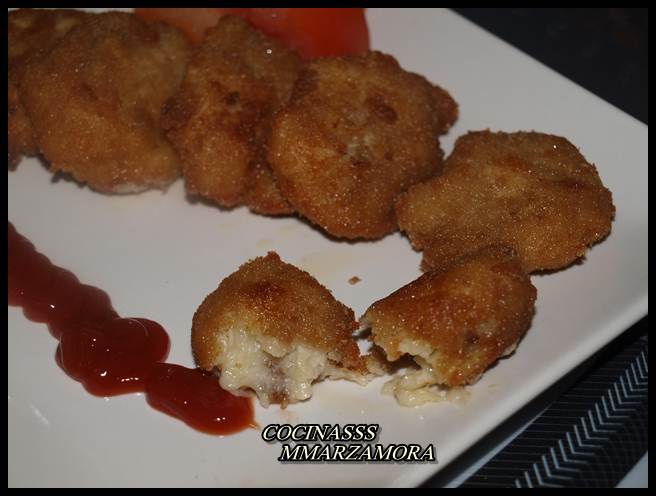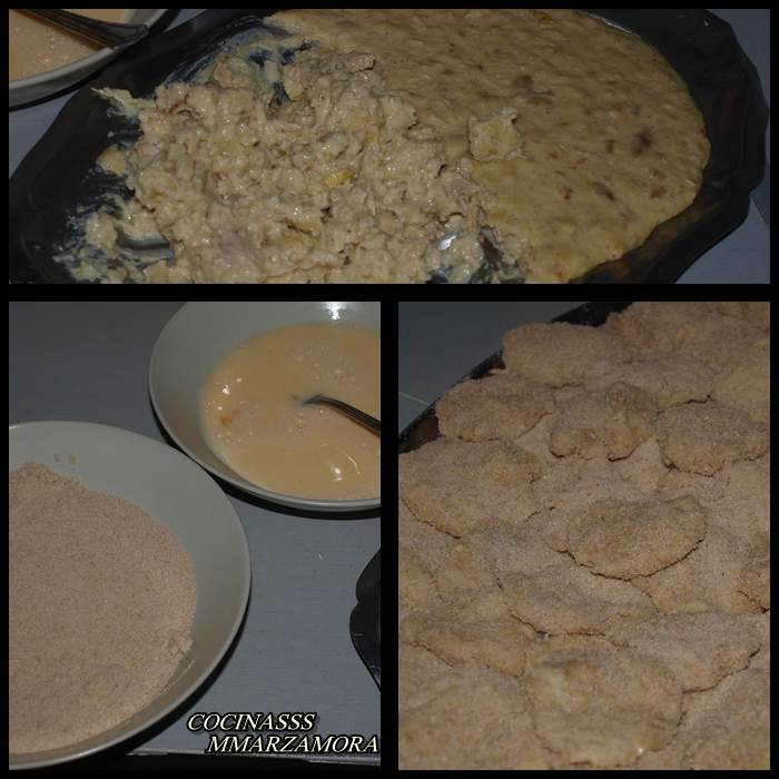5º- Vierto en una fuente y dejo enfriar. Después de un par de horas se da la forma a las croquetas, se pasan por harina, huevo y pan rallado y se fríen en abundante aceite a temperatura media.