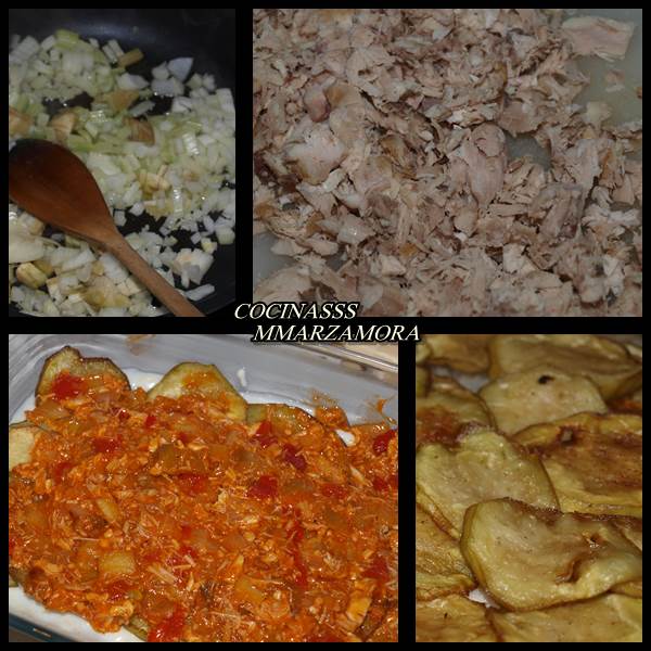5- Montamos el pastel, yo siempre pongo bechamel en el fondo de la fuente y añado salsa de tomate (intentad que sea salsa casera), a continuación lo montamos como una lasaña, capa de las rodajas de patata y calabacín, capa de verduras y pollo y otra vez bechamel; repetimos la operación hasta que no nos queden ingredientes o hasta llenar el recipiente, y, por último, agregamos el queso rallado por encima de la última capa de bechamel.