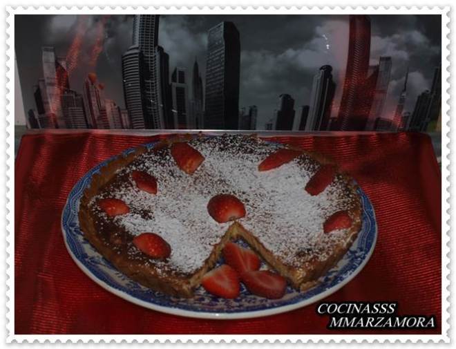 5º- Se deja enfriar y se desmolda. Después se decora al gusto del los/as comensales. Yo puse azúcar glas y una cuantas fresas.