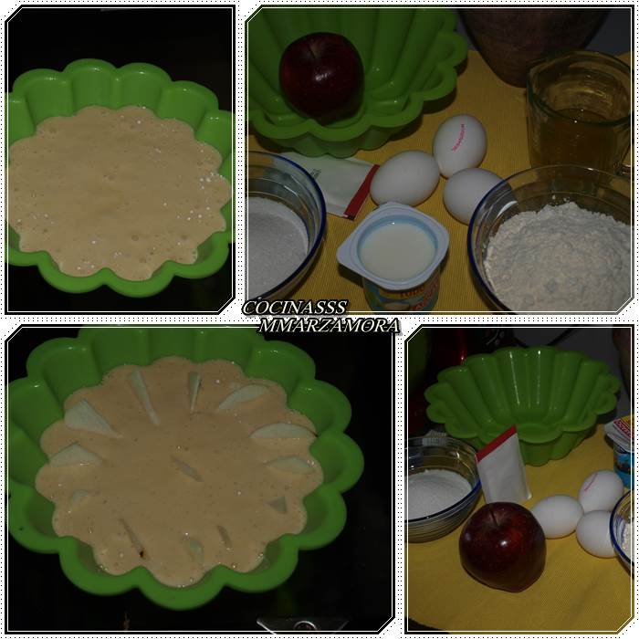 3- Por último pelo la manzana y corto en finos gajos. El modelo que utilizaré es una flor, le pongo aceite antihaderente, y coloco en el fondo los trozos de manzana, vierto la masa, y voy añadiendo dentro de la masa más trozos de fruta. Agrego algunos gajos encima de la masa.
