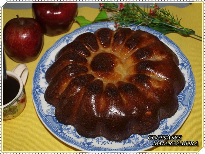 Este tipo de bizcocho que es bastante tradicional, lo he hecho con trozos de manzana. La base es de un bizcocho de yogur natural azucarado, y después le he puesto bastante trozos de fruta por todo el molde.