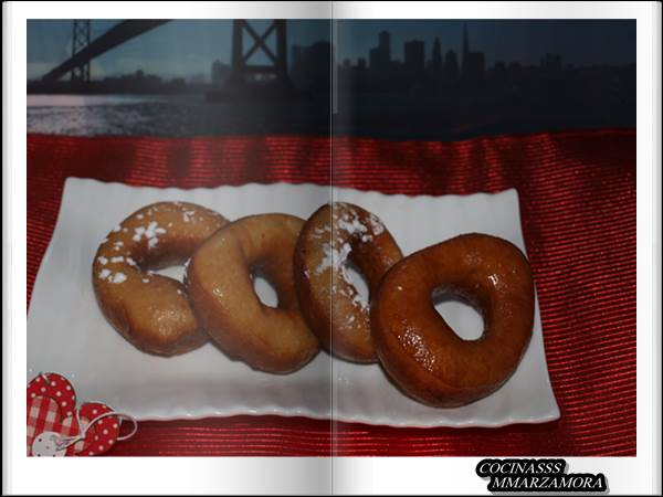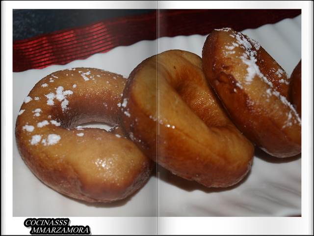 He buscado varias veces la receta pero siempre me ha parecido un proceso largo y muy entretenido.De entre todas las recetas que he visto, y he visto muchas, me quedo con esta receta que encontré en youtube.com “Las recetas de MJ”, Donuts clásicos y rellenos. Yo a esta receta le he hecho algunos cambios, he puesto más levadura y no toda la mantequilla que marcaba la receta, puse unos mililitros de aceite de girasol. Para ser la primera vez no están mal, pero creo que lo mejoraré en otras ocasiones, la próxima vez de chocolate.