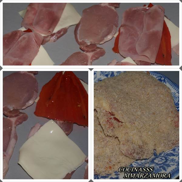 Pero cuando se rellenan carnes, una buena forma de cocinarla es con un rebozado, y para esta receta he decidido hacer chuletas de lomo de cerdo (sin hueso, por supuesto), rellenas de jamón serrado, queso y pimientos del piquillo. Creo que el toque de pimiento rojo asado es fantástico. El pan rallado me gusta más el que venden en el súper, pero cuando tengo pan duro en casa, lo rallo y también lo utilizo, el pan duro que tengo en casa siempre produce mucha miga y no queda igual a la hora de freír, pero no por ello dejo de utilizarlo.