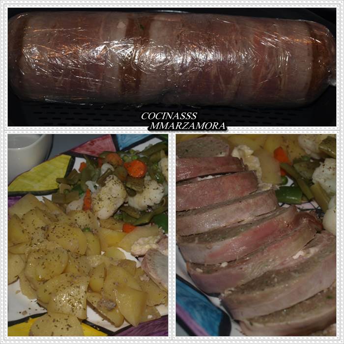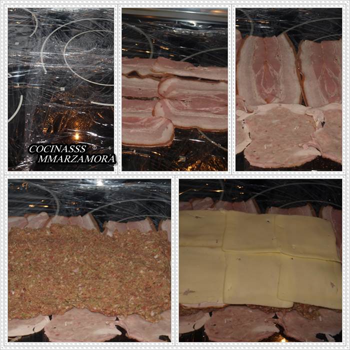 3- Ahora vamos a montar el pan de carne o rollo de carne, primero pongo capas de papel transparente o film encima de la encimera. Sobre el papel film se coloca las lonchas de beicon formando un cuadrado, se coloca encima la carne picada dejando que sobresalga el beicon 2 ó 3 cm por el borde superior. Encima de la carne se coloca el jamón york, y encima del jamón el queso. Ahora un poquito de manualidades, se enrolla como si fuera un brazo de gitano y se sella por los extremos apretando muy bien. Una vez enrollado con el papel film, se pincha con una brocheta para hacer algunos agujeros para que entre mejor el vapor y se deja reposar.