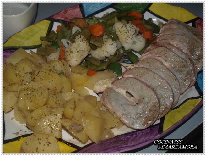 6- Pasado los 25 minutos, quitamos el recipiente varoma que está encima del vaso, y con cuidado abrimos el vaso, e introducimos el cestillo, que llevará dentro las patatas peladas y en trozos no muy grandes, cerramos el vaso, volvemos a poner la fuente encima y ahora añadimos las verduras alrededor del rollo de carne y cerramos el varoma. Volvemos a programar otros 25 min/varoma/vel1. En el caso de no tener TH, se harán las verduras al vapor o se cocerán, ya al gusto del comensal. Y la carne deberá estar un total 50 minutos de cocción al vapor.