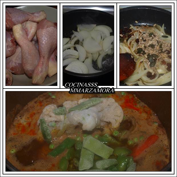 3- Una vez dorado el pollo, agrego medio litro de agua más o menos o hasta que cubra el pollo, y un vaso de vino blanco. Ahora añado la cebolla caramelizada, y un puñado de cada una de las verduras, esto depende ya del gusto de cada uno/a y de las verduras que tengamos a mano, yo he puesto las que tenía congeladas en trozos grandes, como la coliflor, zanahorias, calabaza, unos guisantes y habichuelas verdes. Añado las especias, el tomate y la sal. Cierro la olla y una vez que salta la válvula la dejé entre 7-8 minutos a fuego medio.