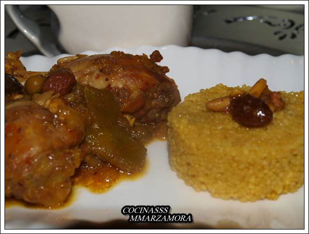 4- Pasado ese tiempo abro la olla, y saco todo el pollo, y dejo reducir un poco mas el caldo con la verduras, añado los piñones y las pasas. También retiro de la olla una taza de caldo, más o menos 250 mililitros, para hacer el cuscús. Mientras el caldo de la olla se va reduciendo con las verduras, pongo en una fuente grande, el grano del cuscús, añado el caldo muy caliente recién sacado de la olla, tapo la fuente y reservo 5 minutos.