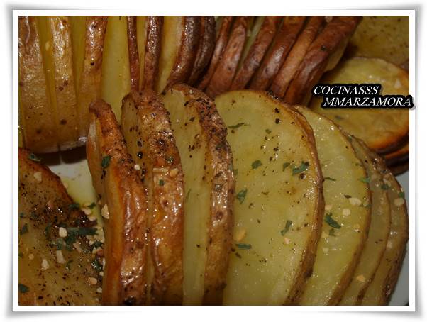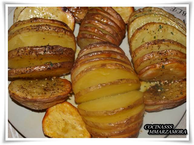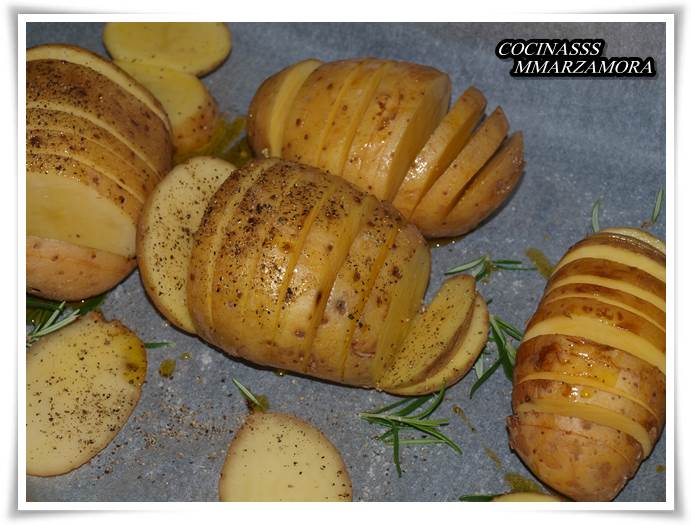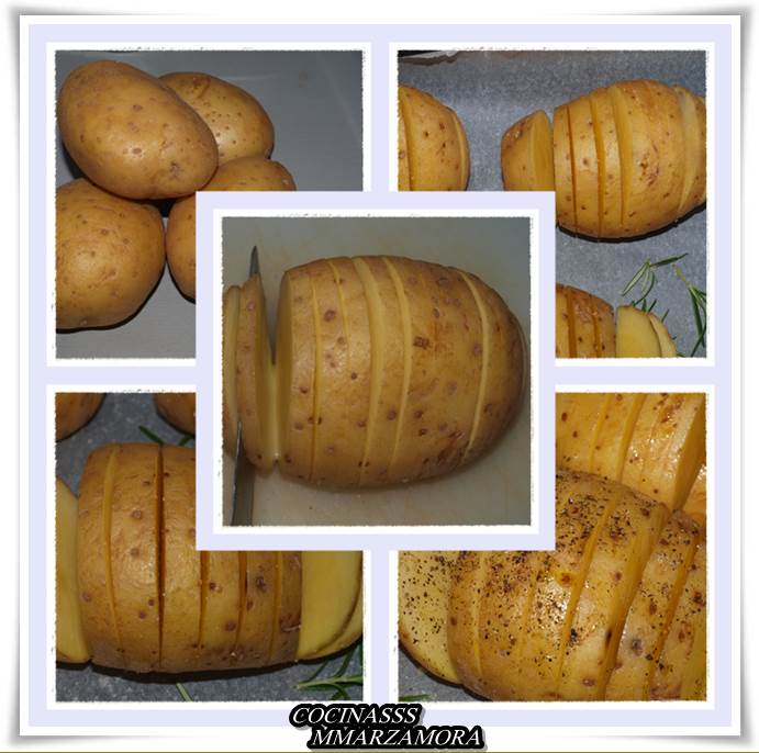2º- Mientras el horno se va calentando, se lavan bien las patatas, y se procede a cortarlas. El corte debe ser más o menos igual entre cada rodaja. Para que la patata no se mueva, se corta la parte de abajo y se deja plana, para que no se mueva en el horno. Después se va cortando en rodajas de 5 mm sin llegar hasta abajo. Se aprecia bien en la foto.