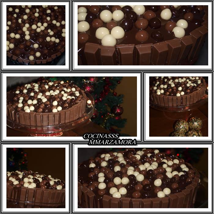 5- Por todo el borde de la tarta los trozos de las barritas de kit kat (las parto por la mitad ), y después se añaden las bolas de chocolate de diferentes colores encima del bizcocho.