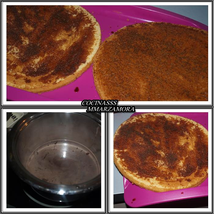 2- Se hace el almíbar, todos los ingredientes se ponen en un cazo y se lleva a ebullición. Se aparta y deja enfriar. Después con una brocha, se “emborracha” el bizcocho.
