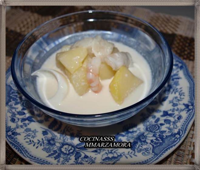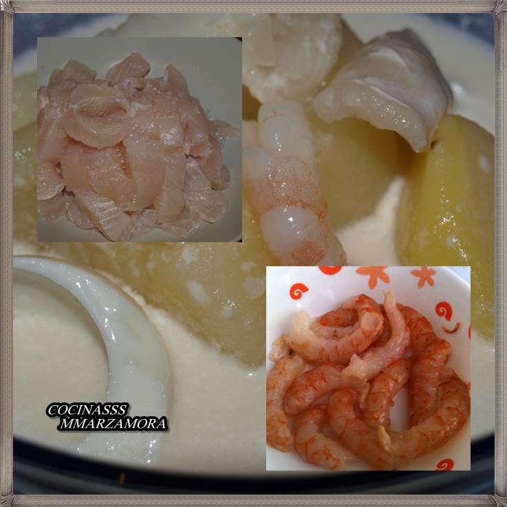 2º- Se dejan cocer las patatas como unos 10 minutos. Cuando falten 3 minutos se añade marisco y pescado al gusto. En mi caso algunas almejas, gambas recién peladas y unos trocitos de rosada, bajamos el fuego y se acaba de hacer todo junto. Se retira del fuego y se deja templar por lo menos 40 minutos, necesitamos que el caldo esté templado.