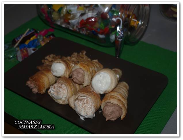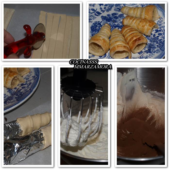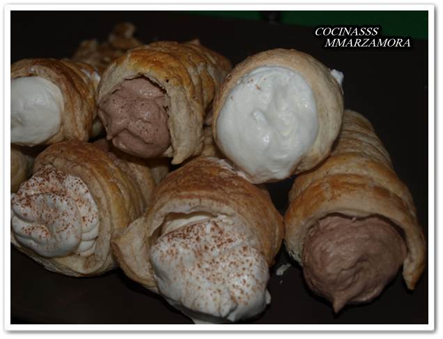 Hoy, hojaldre y nata, una suma perfecta para un dulce riquísimo. Además también ha habido que realizar manualidades, había que dar al hojaldre forma de cono y yo no he encontrado mis moldes, así que tuvimos que improvisar.