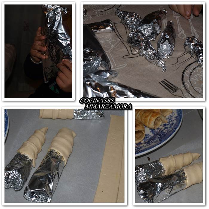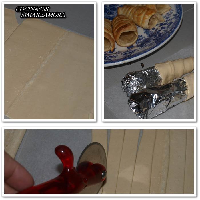 1- Cortar el hojaldre en tiras de 1,5 ó 2 cm de grosor. Los moldes tienen que tener forma de cono, untamos el molde con un pincel y el aceite de girasol. Desde la punta del molde se va da dando la vuelta al cono con la tira de hojaldre. Así hasta utilizar todos los conos. Si no tenemos muchos moldes, una vez sacados del horno, se vuelve a repetir la misma operación antes mencionada.