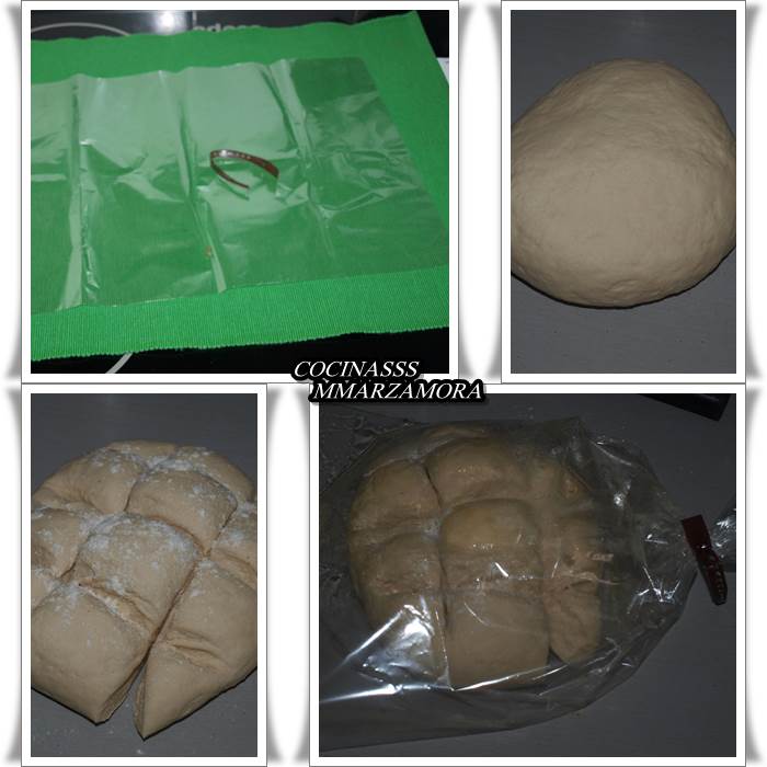 3-Saca la masa del vaso. Dale forma de bola y aplástala un poco. Haz unos cortes en la superficie para dejar un dibujo de cuadrícula y luego espolvorea con harina. Introduce el pan dentro de una bolsa de asar con un poco de aceite de oliva. Cierra la bolsa con el plastiquito que viene acompañando a la bolsa y mete el pan en el horno frio.
