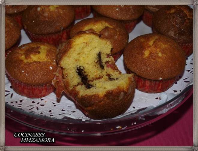 5- En una bandeja ponemos moldes de magdalenas, se vierte sobre cada molde la masa hasta la mitad, se introduce una pastilla o dos de chocolate y después un poco mas de masa. Hay que acordarse de no llenar hasta arriba los moldes, solo 3/4 partes. Se aconseja dejar enfriar de media hora a una hora.